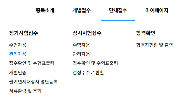 ´Üü´ã´çÀÚ´Â ´ëÇÑ»ó°øÈ¸ÀÇ¼Ò ÀÚ°ÝÆò°¡»ç¾÷´Ü ÆäÀÌÁö¿¡¼ ´Üü ȸ¿ø°¡ÀÔ ÇϽñ⠹ٶø´Ï´Ù. Á¢¼öÀÚ ¶ÇÇÑ °¡ÀÔµÈ È¸¿ø¸¸ Á¢¼ö °¡´ÉÇÕ´Ï´Ù. 1. »ó°øÈ¸ÀÇ¼Ò ÀÚ°ÝÆò°¡»ç¾÷´Ü ȨÆäÀÌÁö¿¡¼ [´ÜüÁ¢¼ö]-[Á¤±â/»ó½Ã ½ÃÇèÁ¢¼ö]-[°ü¸®ÀÚ¿ë] Ŭ¸¯