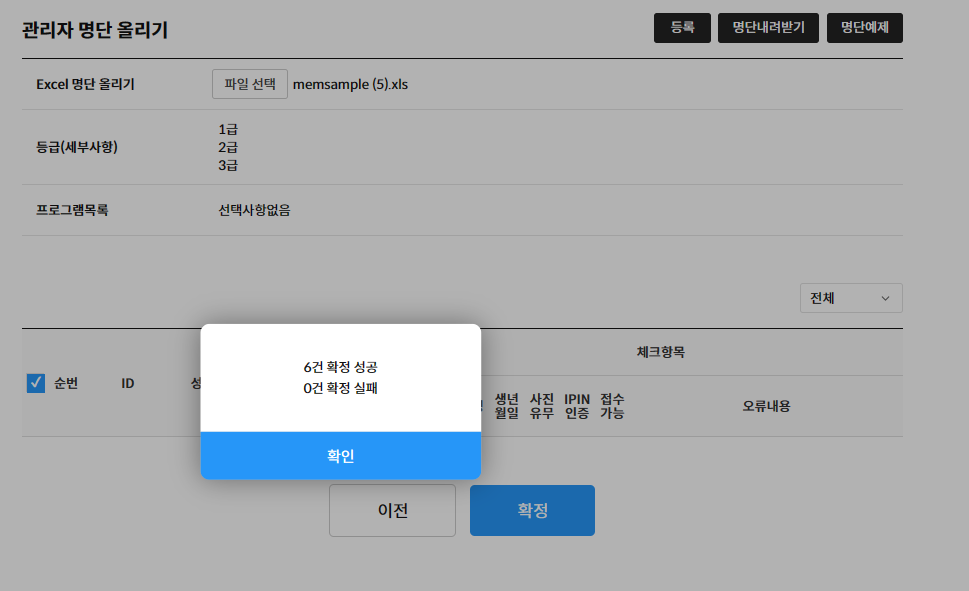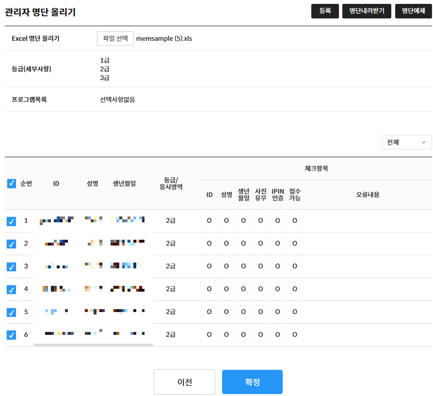 [¿¹Á¦ÆÄÀÏ] ¹öưÀ» Ŭ¸¯ÇÏ¿© ¿¢¼¿ÆÄÀÏÀ» ³»·Á¹ÞÀº ÈÄ ¼öÇèÀÚ ¸í´ÜÀ» ±âÀÔÇÕ´Ï´Ù. ¼öÇèÀÚ ¸í´ÜÀÌ ±âÀÔµÈ ¿¢¼¿ÆÄÀÏÀ» [Excel ¸í´Ü ¿Ã¸®±â] Ç׸ñ¿¡¼ ¾÷·Îµå ÇÒ ÆÄÀÏÀ» ¼±ÅÃÇÕ´Ï´Ù. À̾î [µî·Ï]¹öưÀ» Ŭ¸¯ÇÏ¿© ¼öÇèÀÚ ¸í´ÜÀ» ÆäÀÌÁö¿¡ ºÒ·¯¿É´Ï´Ù. ¸í´Ü µî·ÏÀÌ ¾ÈµÇ´Â °æ¿ì ¿À·ù³»¿ëÀ» È®ÀÎÇÏ¿© °³º° ¼öÇèÀÚ¿¡°Ô »çÁøµî·Ï, º»ÀÎÀÎÁõÀ» ÁøÇàÇϵµ·Ï ¾È³» ÇÕ´Ï´Ù. ºÒ·¯¿Â ¼öÇèÀÚ ¸í´ÜÀ» ¼±ÅÃÇÏ¿© [È®Á¤] ¹öưÀ» Ŭ¸¯ÇÏ¸é ½ÃÇèÁ¢¼ö°¡ °¡´ÉÇÑ ¸í´Ü¿¡ µî·ÏÀÌ ¿Ï·áµË´Ï´Ù.