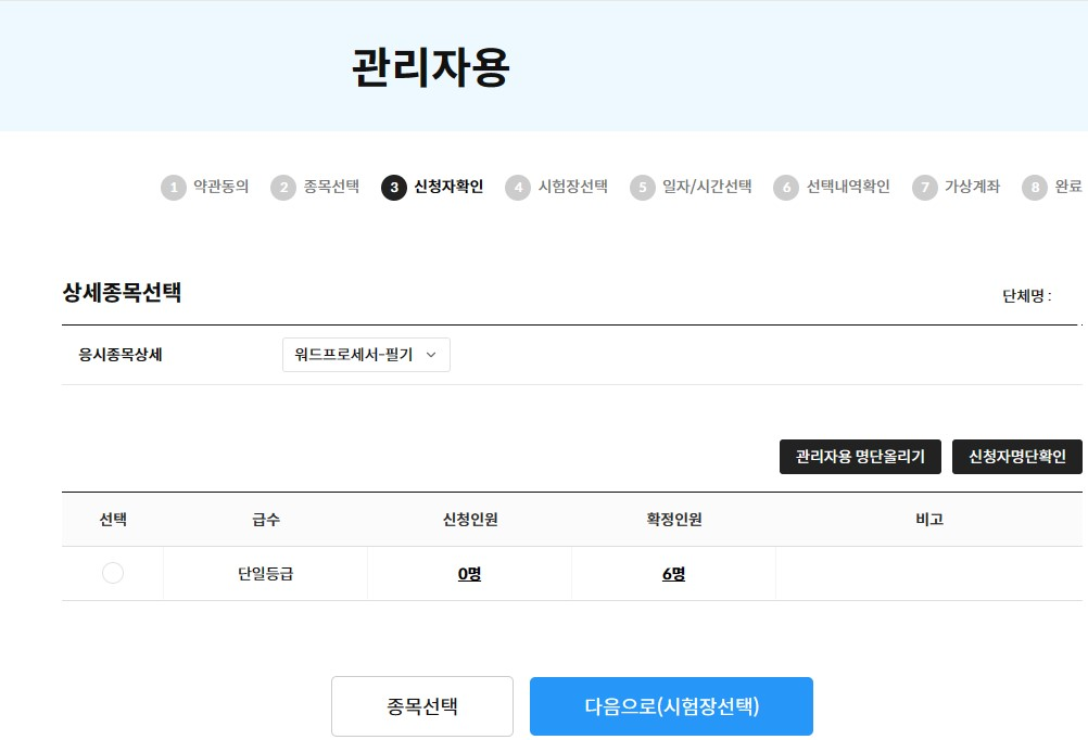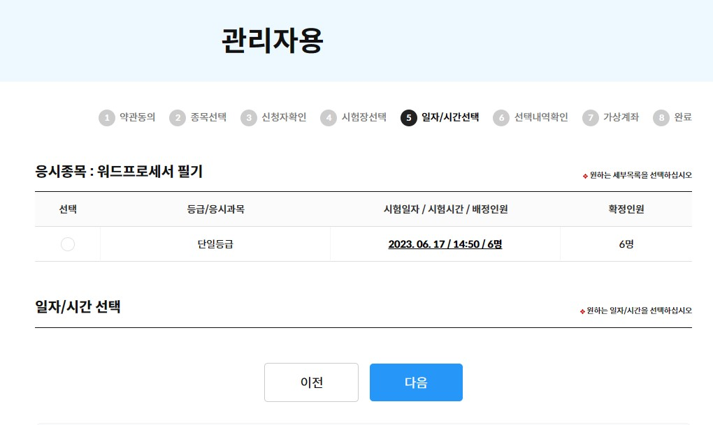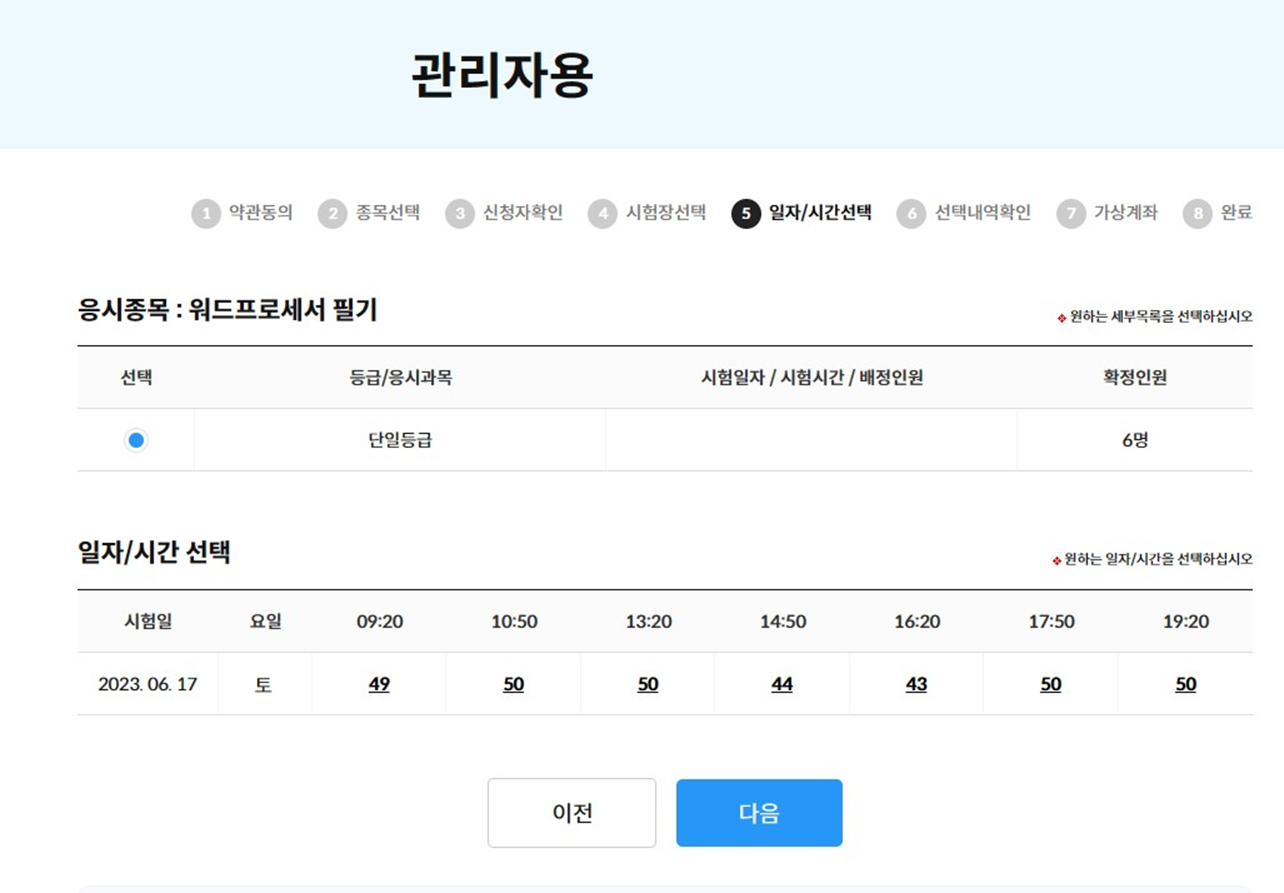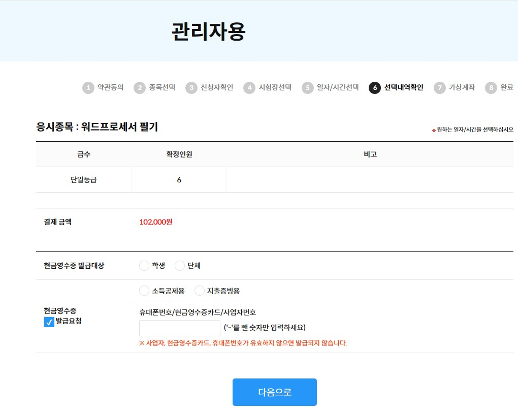ÀÏÁ¤ÀúÀå ÈÄ ½ÃÇèÀÏÀÚ/½ÃÇè½Ã°£/¹èÁ¤Àοø È®ÀÎ ÈÄ [´ÙÀ½]¹öưÀ» Ŭ¸¯ÇÕ´Ï´Ù. 7. ¼±Å󻿪ȮÀÎ