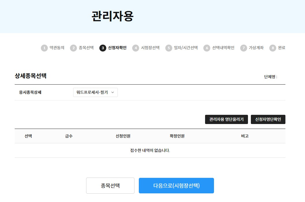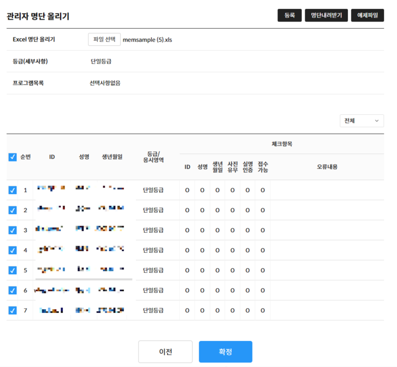 [¿¹Á¦ÆÄÀÏ] ¹öưÀ» Ŭ¸¯ÇÏ¿© ¿¢¼¿ÆÄÀÏÀ» ³»·Á¹ÞÀº ÈÄ ¼öÇèÀÚ ¸í´ÜÀ» ±âÀÔÇÕ´Ï´Ù. ¼öÇèÀÚ ¸í´ÜÀÌ ±âÀÔµÈ ¿¢¼¿ÆÄÀÏÀ» [Excel ¸í´Ü ¿Ã¸®±â] Ç׸ñ¿¡¼ ¾÷·Îµå ÇÒ ÆÄÀÏÀ» ¼±ÅÃÇÕ´Ï´Ù. À̾î [µî·Ï]¹öưÀ» Ŭ¸¯ÇÏ¿© ¼öÇèÀÚ ¸í´ÜÀ» ÆäÀÌÁö¿¡ ºÒ·¯¿É´Ï´Ù. ¸í´Ü µî·ÏÀÌ ¾ÈµÇ´Â °æ¿ì ¿À·ù³»¿ëÀ» È®ÀÎÇÏ¿© °³º° ¼öÇèÀÚ¿¡°Ô »çÁøµî·Ï, º»ÀÎÀÎÁõÀ» ÁøÇàÇϵµ·Ï ¾È³» ÇÕ´Ï´Ù. ºÒ·¯¿Â ¼öÇèÀÚ ¸í´ÜÀ» ¼±ÅÃÇÏ¿© [È®Á¤] ¹öưÀ» Ŭ¸¯ÇÏ¸é ½ÃÇèÁ¢¼ö°¡ °¡´ÉÇÑ ¸í´Ü¿¡ µî·ÏÀÌ ¿Ï·áµË´Ï´Ù.